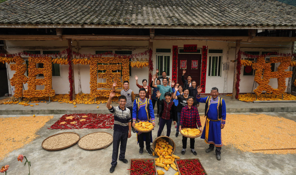9月24日,北川县小坝镇江河村村民秦明其家喜气洋洋,村民们聚集在一起庆祝丰收富裕,感恩伟大祖国。