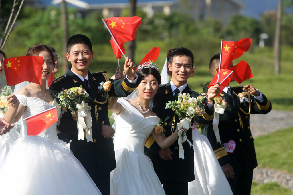 2019年9月22日,在解放军某部营区,举办集体婚礼的新人们幸福地挥舞国旗、欢唱国旗,祝福祖国母亲生日快乐。