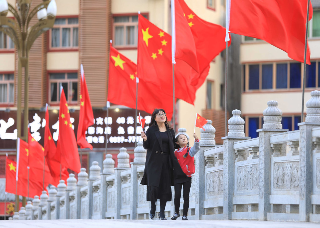 9月25日,阿坝州九寨沟县国旗飘舞,母女俩手持国旗祝福新中国成立70周年生日快乐。 记者 何海洋 摄