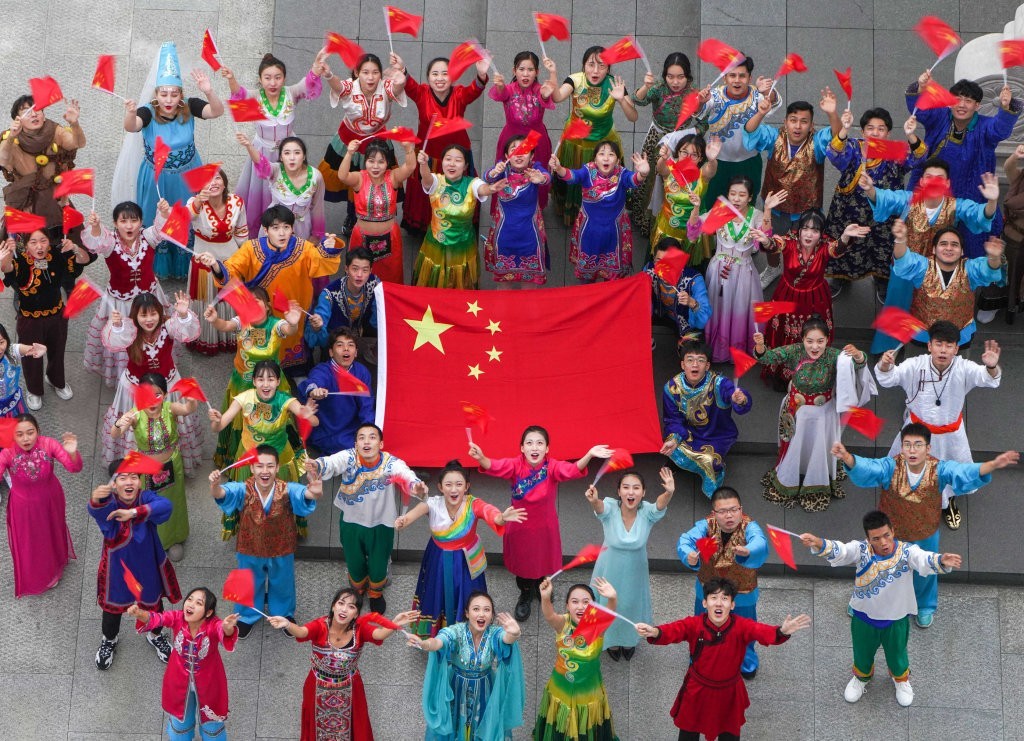 2019年9月18日,西南民族大学56个民族的56名学生代表,身着各自的民族服装挥舞五星红旗携手共庆新中国成立70周年。