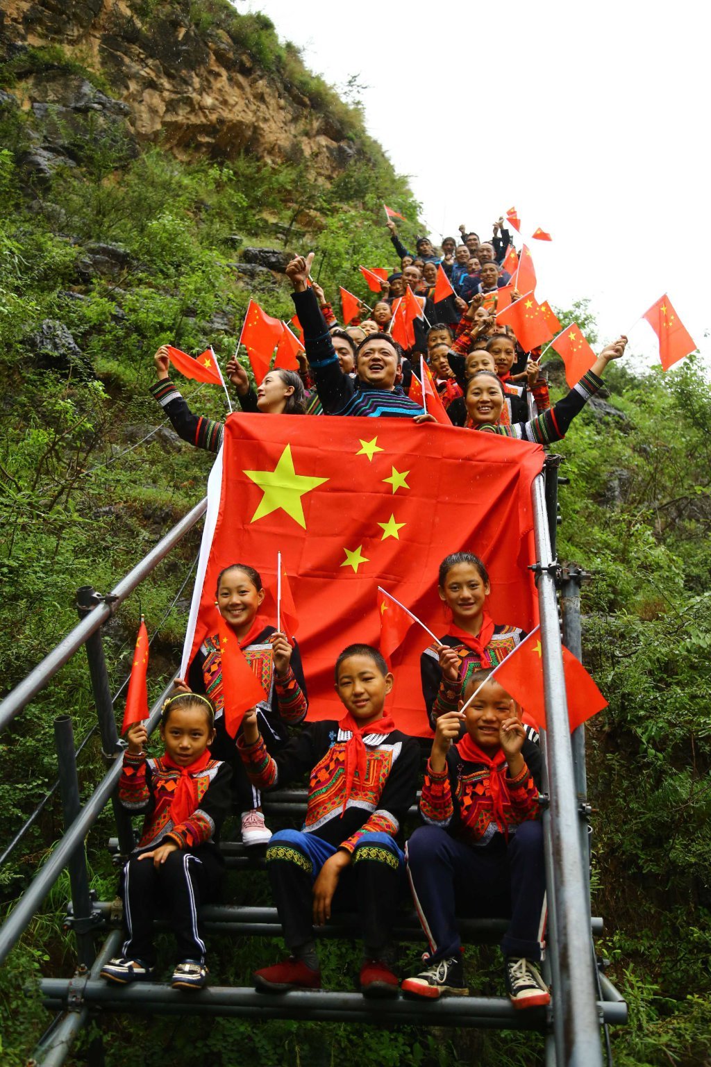 2019年国庆前夕,凉山彝族自治州昭觉县阿土列尔村小学的老师和孩子们在改造后的钢梯上一起祝福新中国70华诞生日快乐。 阿克鸠射 摄(视觉四川)