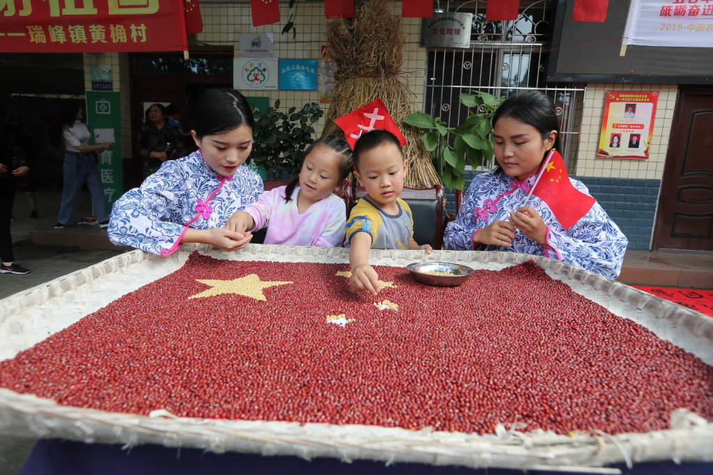 9月21日, 眉山市青神县黄桷村,村民用丰收的黄豆和红豆拼成一面五星红旗,喜迎新中国70周年华诞 。 张忠苹 摄