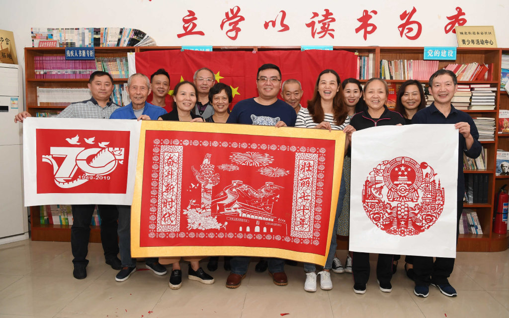 9月17日,德阳市旌阳区城北街道秦宓社区的居民手持“祝福祖国”的剪纸作品,感恩伟大祖国。