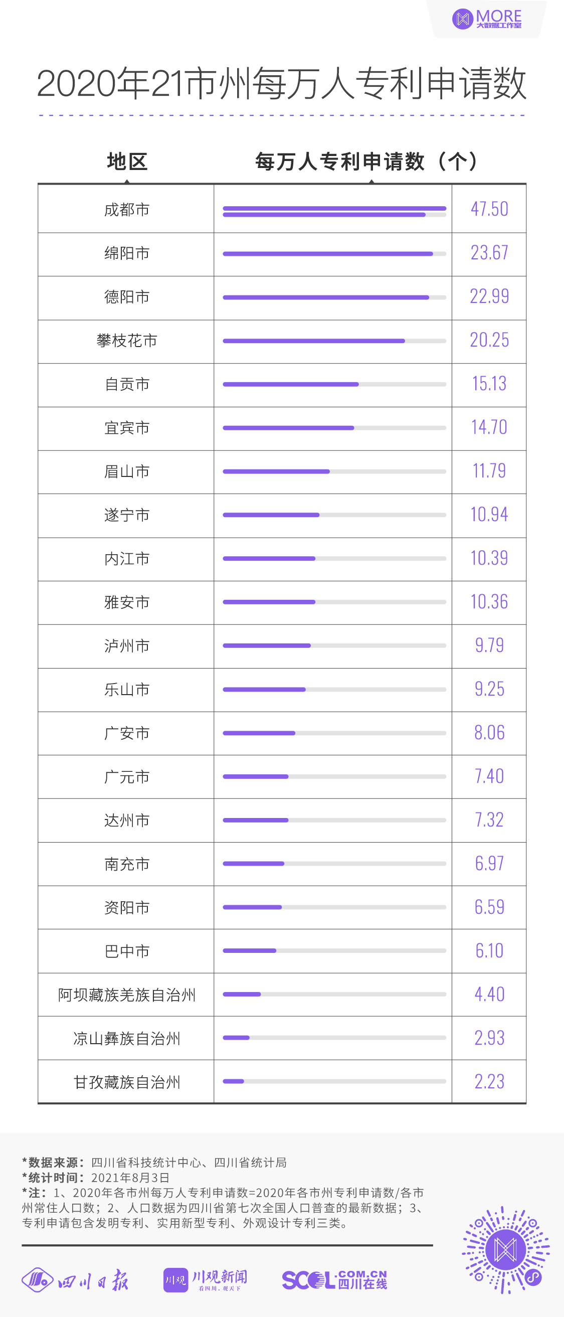 四川省科技统计中心数据显示,2020年四川省专利申请数量达167676个,成都、绵阳、德阳3市占全省总量的70.9%。位列第一的成都市每万人专利申请量为47.5个,是第二名绵阳的两倍。