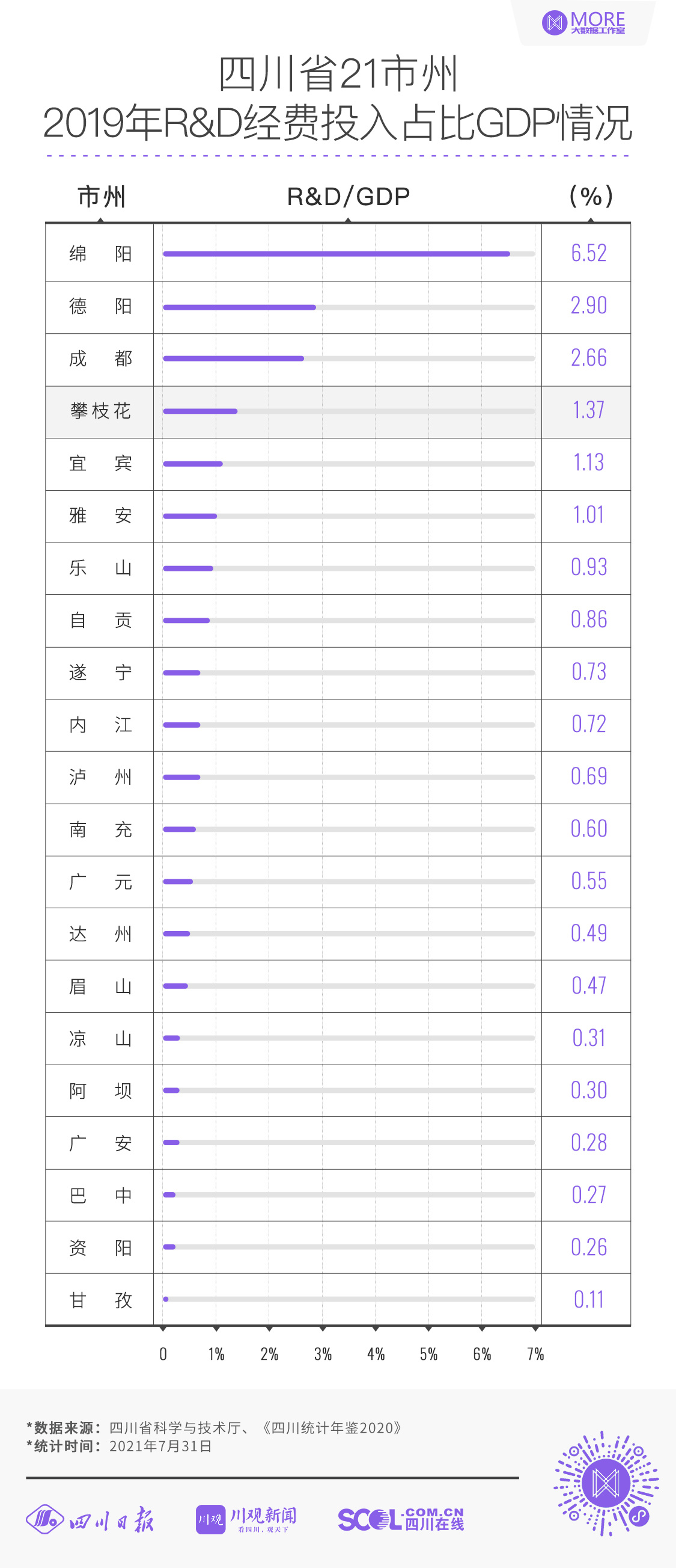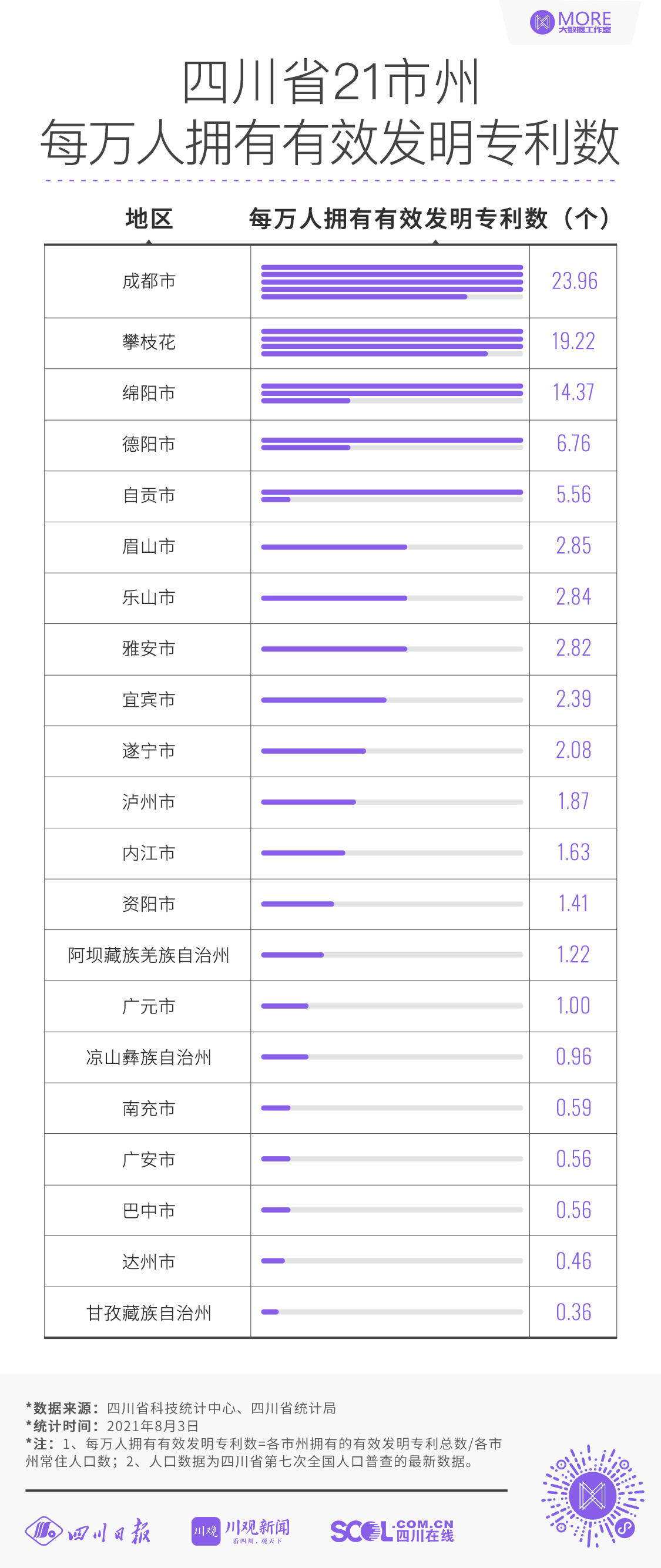 《中国知识产权保护与营商环境新进展报告(2020)》数据显示截至2020年年底,中国内地每万人口发明专利拥有量达到15.8件。四川省21市州,仅成都和攀枝花高于全国平均标准。此外,四川省每万人拥有有效发明专利数为8.4个,只有成都、攀枝花和绵阳三市州超过全省平均水平。