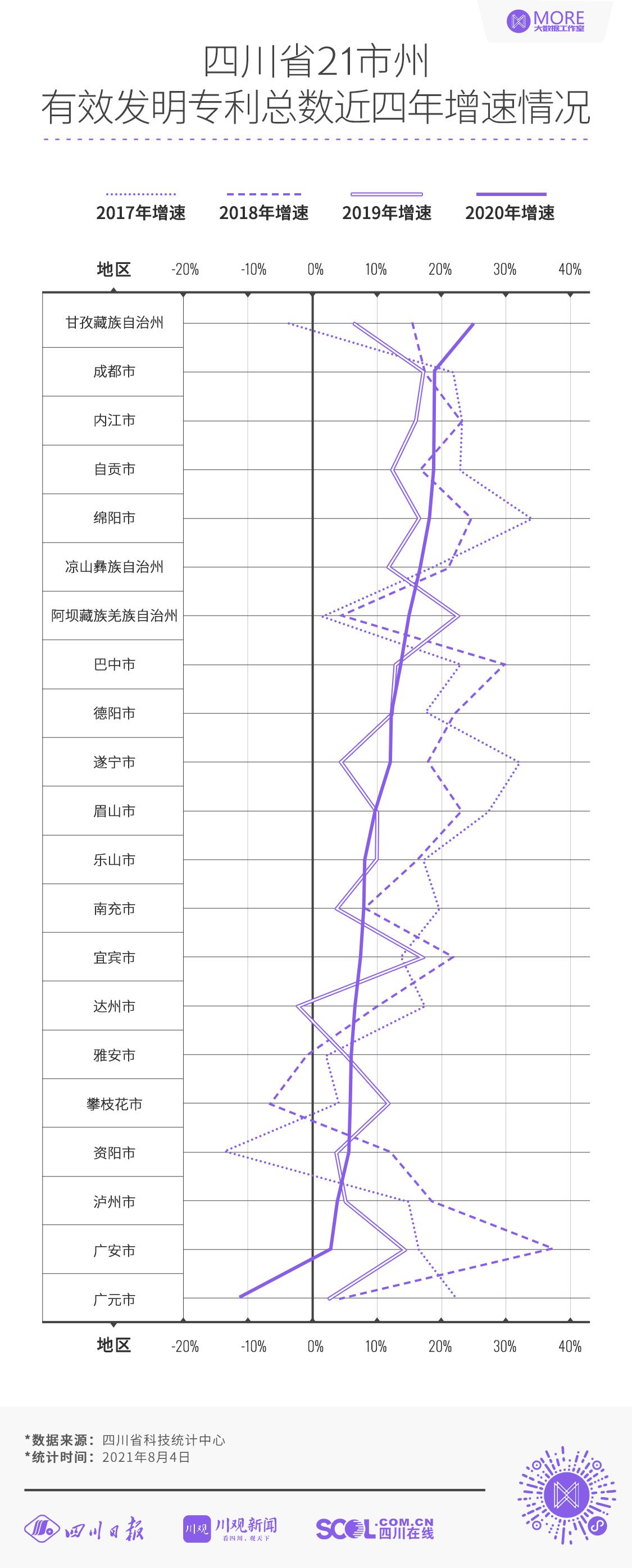 从近4年有效发明专利增速来看,成都、德阳、绵阳、自贡、内江、巴中和凉山共计7个市州,近4年来增速均超过10%。其中,成都有效发明专利存量和增量均较大,2019年和2020年增速位列第二。2019年和2020年增速排名第一的市州分别是阿坝和甘孜。