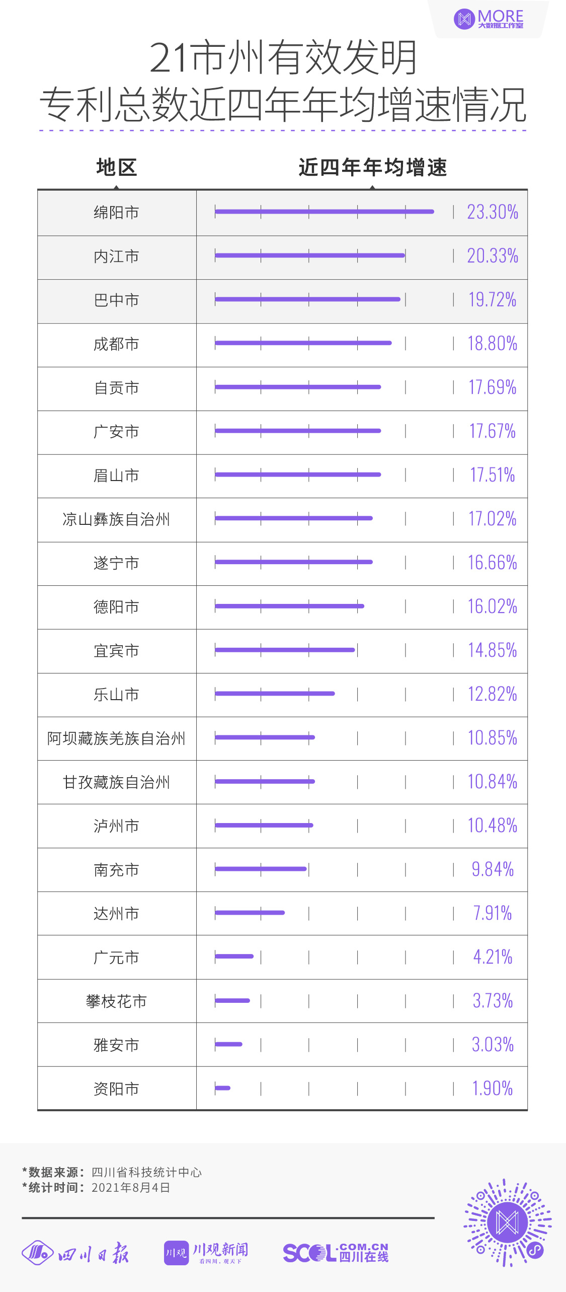从有效发明专利年均增速来看,绵阳市近四年增速23.3%,排名全省第1。内江市和巴中市年均增速分别是20.33%、19.72%,位列第2、第3。