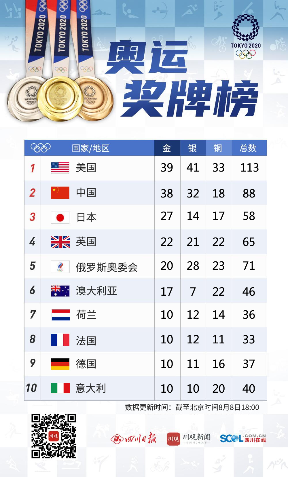 8月8日,东京奥运会的最后一个比赛日。截至北京时间18:00,美国代表团由于连续进账3枚金牌,后来居上,以39枚金牌站到了奥运奖牌榜的首位。中国代表团以38枚金牌、31枚银牌、18枚铜牌的成绩,位居奖牌榜第二位。日本还是稳稳排在第三位。