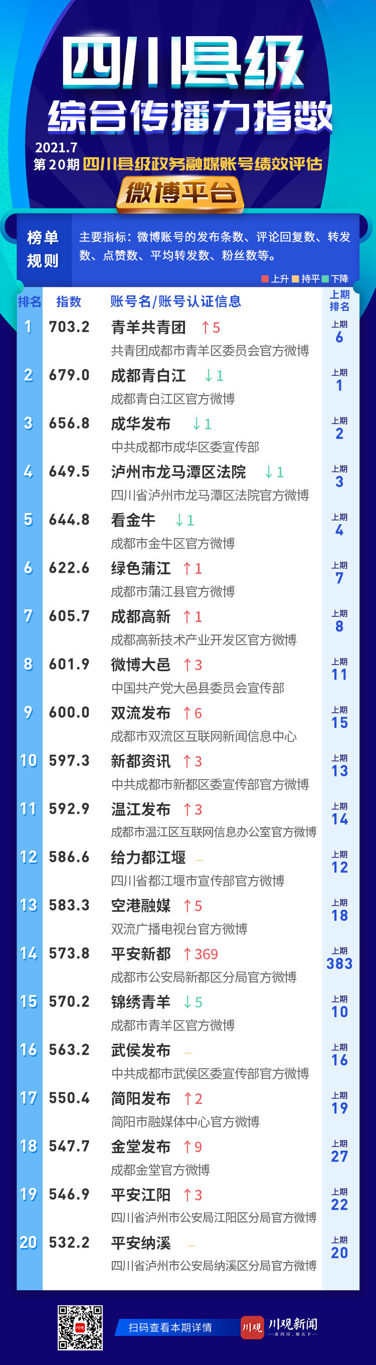 微博平台前20名账号依次是:青羊共青团、成都青白江、成华发布、泸州市龙马潭区法院、看金牛、绿色蒲江、成都高新、微博大邑、双流发布、新都资讯、温江发布、给力都江堰、空港融媒、平安新都、锦绣青羊、武侯发布、简阳发布、金堂发布、平安江阳、平安纳溪。