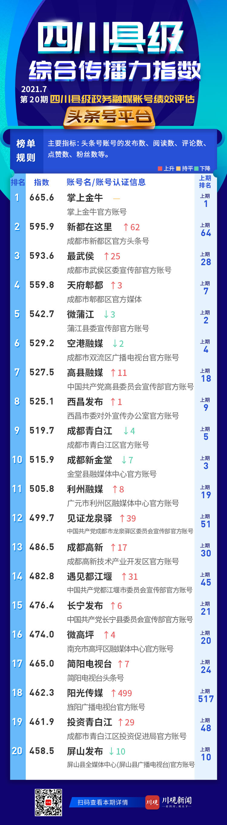 头条号平台前20名账号依次是:掌上金牛、新都在这里、最武侯、天府郫都、微蒲江、空港融媒、高县融媒、西昌发布、成都青白江、成都新金堂、利州融媒、见证龙泉驿、成都高新、遇见都江堰、长宁发布、微高坪、简阳电视台、阳光传媒、投资青白江、屏山发布。
