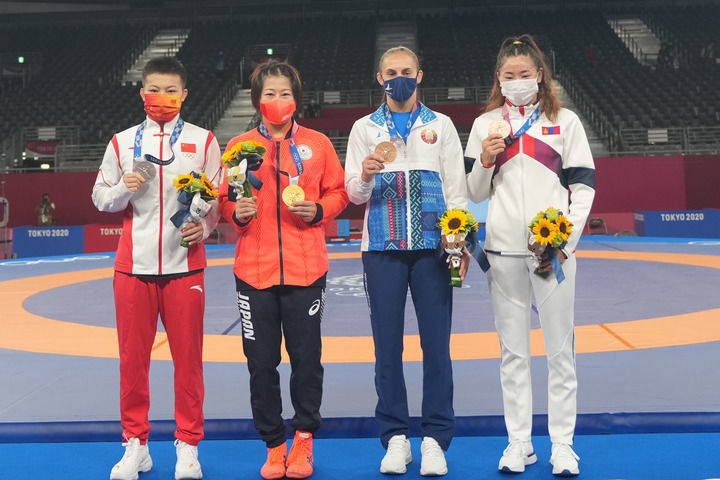 8月6日,日本选手向田真优(左二)、中国选手庞倩玉(左一)、蒙古国选手奥其尔(右一)与白俄罗斯选手瓦妮萨在颁奖仪式上。新华社记者王毓国摄