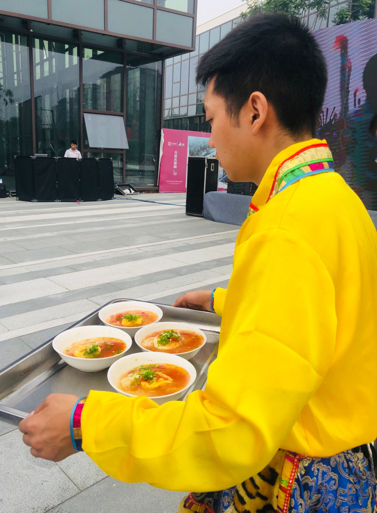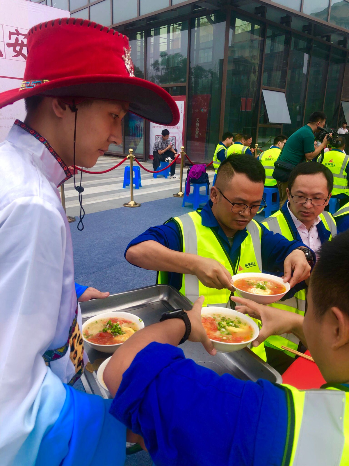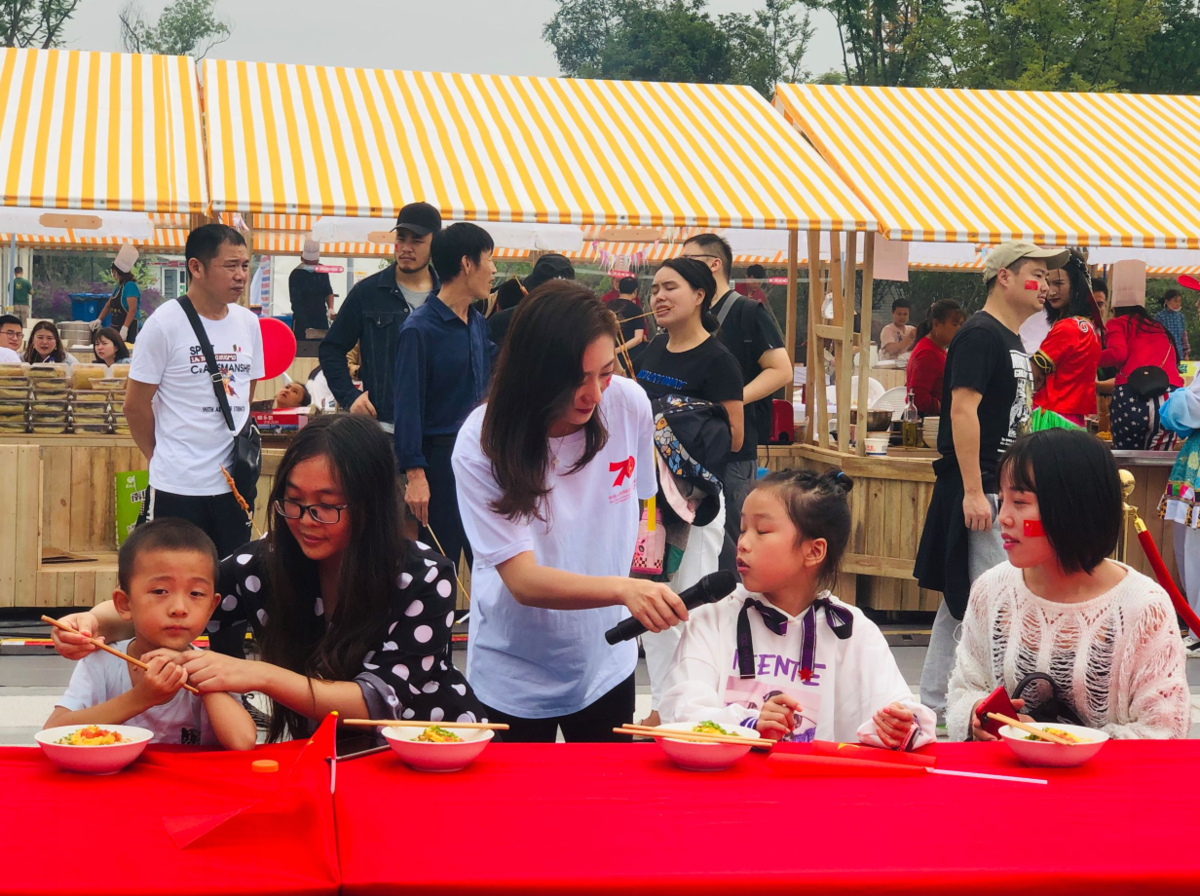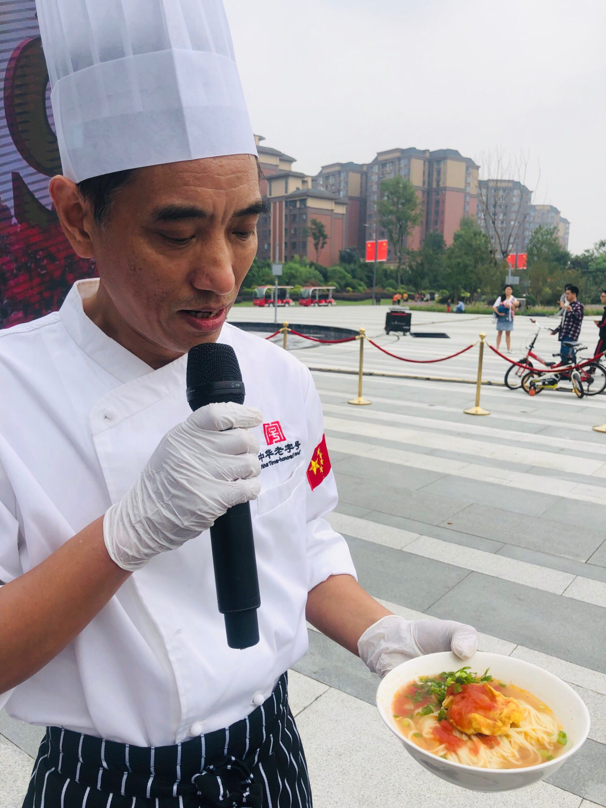 徐洁介绍,成都人爱美食,更爱面食,节日里,多饕餮的盛宴,也比不过一碗家乡的味道,为此我们邀请了担担面第八代传承人何强为70位市民代表制作一碗番茄煎蛋“国庆面”,借国旗颜色的美好寓意,给家乡人送上家乡味。