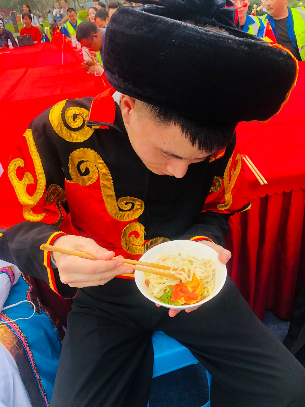 在休闲广场上,长条桌摆成“70”数字的形状,70位市民代表围桌而坐,同吃国庆面,祝福国泰民安。