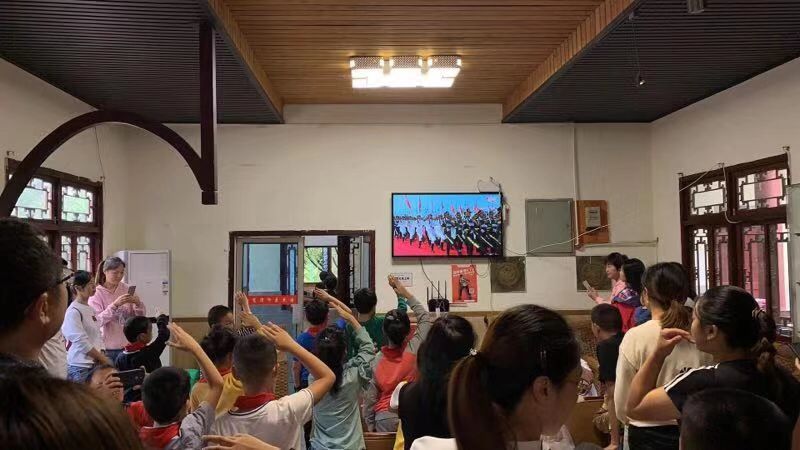 上午10点开始,在洛带镇八角井社区会议室内,社区党员代表、工作人员齐聚一堂,观看阅兵式直播。