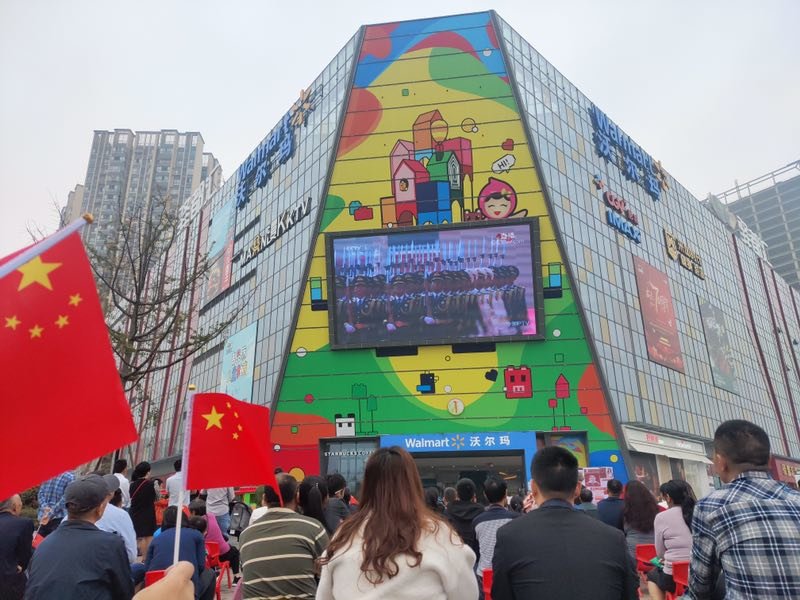 在驿都汇广场上,大阅兵还未开始,人们手拿国旗,聚集在LED大屏幕下。10点整,直播画面国歌响起,市民们纷纷停下脚步,挥动手中红旗,齐唱国歌。当阅兵仪式开始,看到大屏幕上出现一排排人民解放军战士迈着整齐的步伐走来,广场上的气氛也达到了高潮,人群爆发出一阵欢呼声及掌声,每个人脸上都写满了自豪和激动。“在家看电视不如来到广场与大家一起看。”冉先生告诉记者,“看到阅兵仪式上官兵们整齐步伐,心情很澎湃,作为一名中国人,看到国家的强大,民族的昌盛,我感觉非常自豪。”