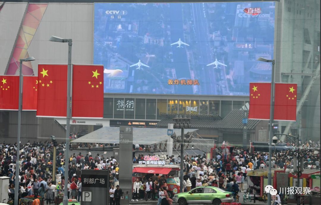 10月1日上午,庆祝中华人民共和国成立70周年大会在北京天安门广场举行,成都市群众以不同的方式观看国庆阅兵式,在成都市区的天府广场、春熙路等地户外大屏幕都进行了转播,吸引了市民的驻足观看,看到各种兵种陆续接受检阅时,现场响起掌声,人们为祖国的强大感到自豪和骄傲。