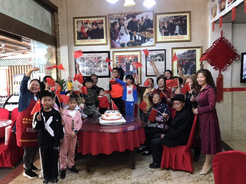 饭店里,有的人拿着小国旗,有的人脸上贴着国旗脸。当庄严的国歌声响起时,大家跟着站起来,挥舞着小国旗,唱起国歌。“听到总书记的讲话,看到威武的军队,特别激动,国家强大了,人民富裕了!”杨云刚说,我们都为祖国的强大而感到自豪。今天是新中国的生日,我们还特地准备了一个二层的大蛋糕,上面写着“祝福祖国生日快乐,70”。“我们要和家人、邻居一同为新中国70华诞庆生,衷心祝福伟大的祖国永远繁荣昌盛。”