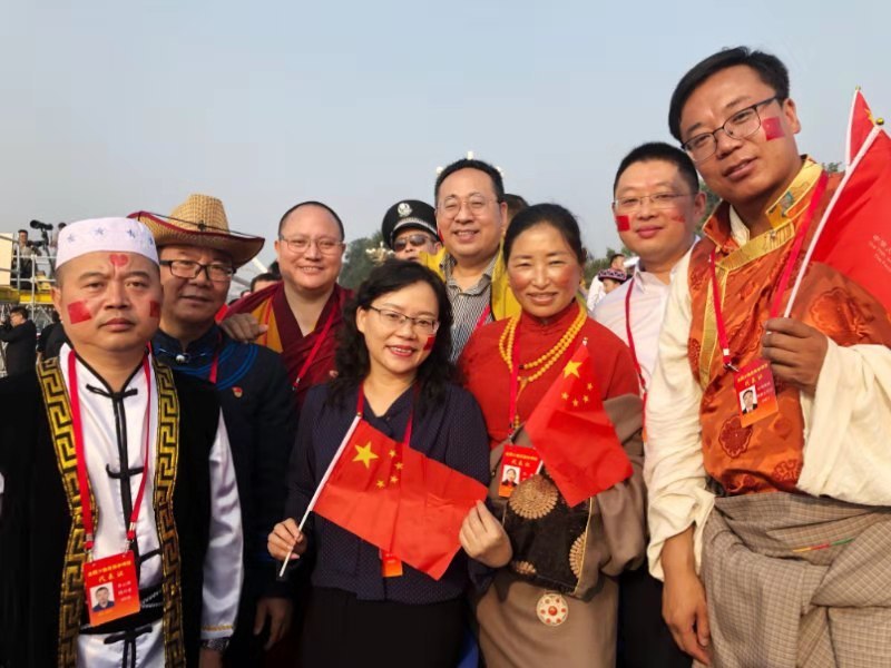 10月1日,是新中国70岁的生日。在北京天安门东侧的观礼台上,阿坝州代表色准穿着崭新的藏装,额头上贴着国旗,现场观看了阅兵仪式。