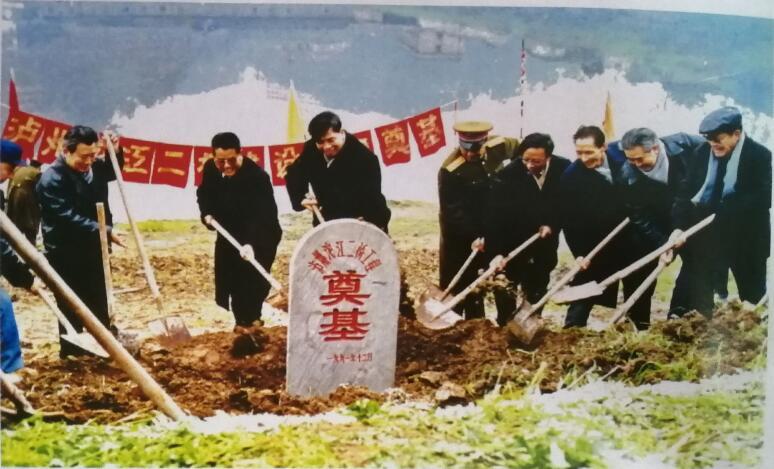1991年12月,原泸州市委书记刘育仁(左三)、原泸州市人大常委会主任张玉清(左一)、原泸州市市长曹锡森(左二)、原泸州军分区政委邵辑良(左四)为百子图沱江大桥奠基。泸州市图书馆供图。