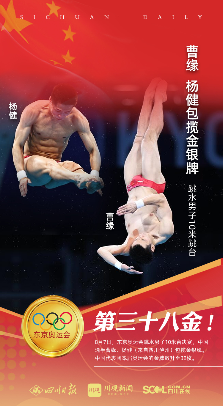 在下午进行的跳水男子10米台决赛中,两位中国选手曹缘和杨健出战比赛。最终,曹缘以582.35分夺得冠军,来自四川泸州的选手杨健以580.40分获得一枚银牌,中国跳水队梦之队收获7金圆满收官。这也是继邹敬园夺得男子双杠金牌后,四川运动员在本届奥运会获得的第二块奖牌。