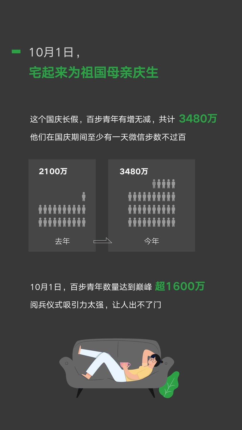 今年国庆,宅在家里的人比去年又多了不少。去年,微信公布了百步青年数据,假期中有2100万人的日运动量少于百步。今年,“假期宅”的生活方式还在延续,并从2100万涨至3480万。10月1日当天,百步青年的数量达到峰值共计1600万。《报告》分析,这可能和许多人在家观看阅兵仪式相关。