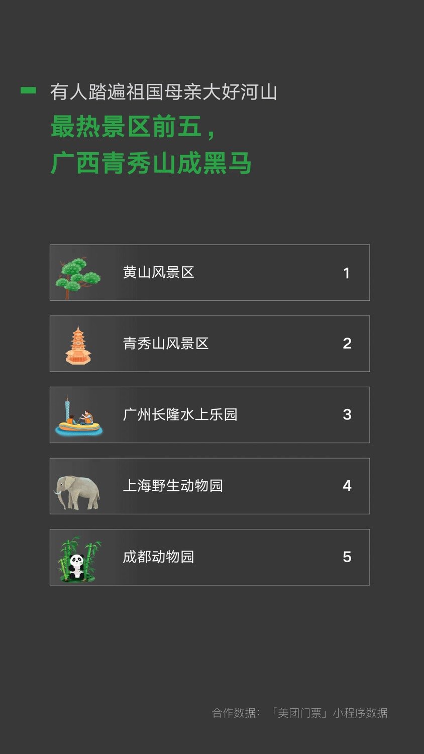 报告根据美团门票小程序数据确定了热门景区排名,前五名依次是黄山风景区、青秀山风景区、广州长隆水上乐园、上海野生动物园和成都动物园。《报告》还对人们欢度国庆的方式进行了梳理分析。