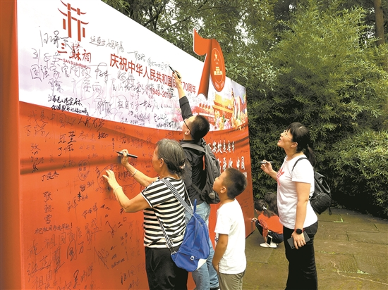 三苏祠博物馆里,不少游客参与“此心安处是吾乡 我爱你中国”的主题活动,祝福新中国70华诞。大家纷纷拿出手机,在景区设置的照片墙下合影,并发朋友圈集赞后,兑换文创小礼品。