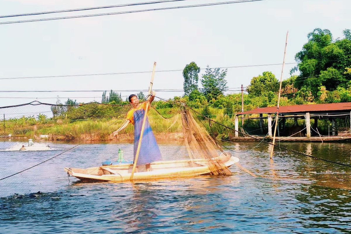 8月3日上午8点,泸州市龙马潭区双加镇大冲头村42公里鱼塘,气温直逼36℃。双加社区居民、大冲头村大春生态渔业合作社社长刘治学系着蓝色防水围腰,光脚踏在木质小船上,穿行在鱼塘中,双手不断将挂在竹竿上的渔网取下、收回。