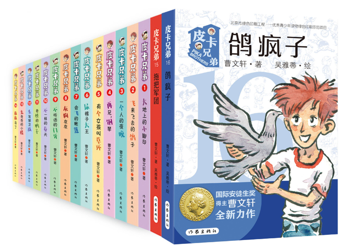“皮卡兄弟”系列丛书已经出版到16部,分别是:《大地上的小脚印》《飞来飞去的鸽子》《一个人的夜晚》《再见,钢琴》《有个女孩叫草环》《尿裤子大王》《会飞的帐篷》《灰狗灰灰》《不听话的门牙》《不一样的春天》《奇怪的鸭子》《头发保卫战》《光秃秃的小楼》《救救马丁》《拖把军团》《鸽疯子》。相较于曹文轩的另两部代表作《草房子》和《青铜葵花》,“皮卡兄弟”系列更加地简约轻快、风趣幽默。16部书、16个故事,曹文轩描绘了16种孩子成长中的人生底色,助力中国孩子的正面成长,让孩子们从中汲取满满的成长正能量。