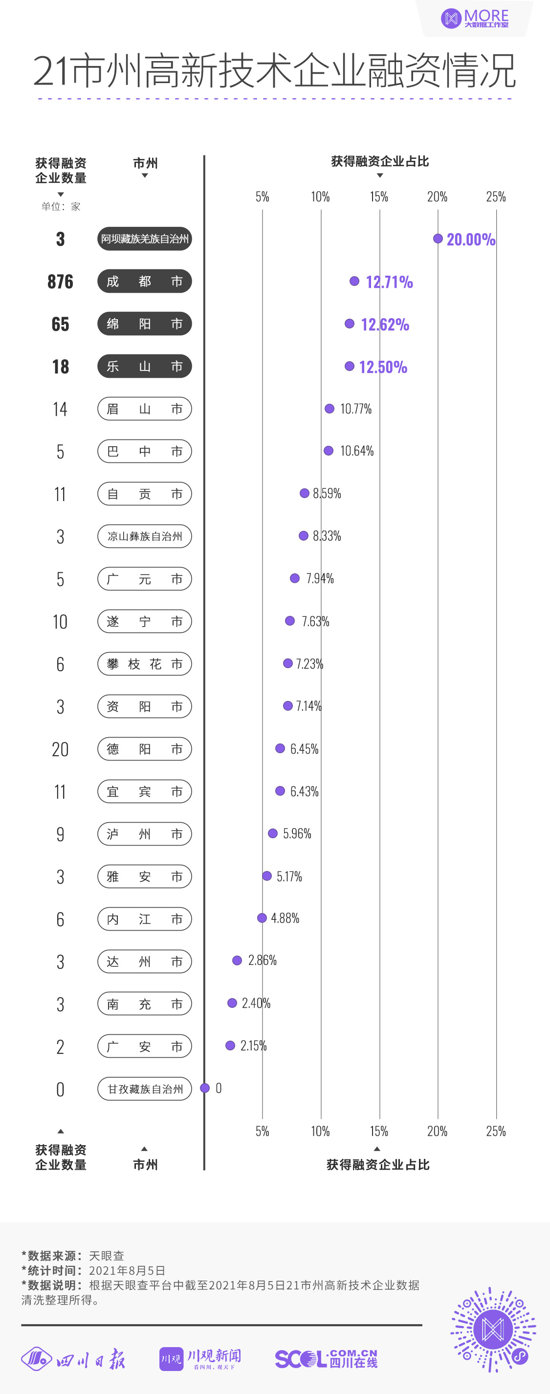 融资能够给企业注入更加强劲的发展动力,为企业创新、研发创造更有利的条件,成都市有876家高新技术企业获得融资。从高新技术企业获得融资的占比来看,21市州中阿坝高新技术企业获得融资的占比最高,达到20%,15家高新技术企业中有3家获得融资。成都、绵阳、乐山紧随其后,获得融资的高新技术企业比例均超过12%。阿坝州近年来着力建设全国最大的锂矿生产基地,其3家获得融资的企业均深耕于锂材料或锂电池生产行业,其中有两家已完成A轮融资,受到资本青睐。