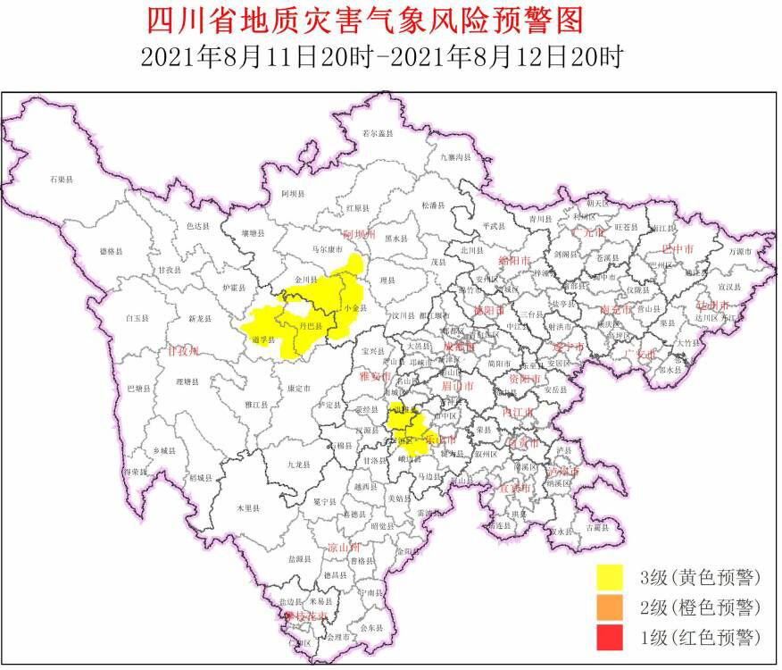 8月11日,四川省地质灾害指挥部办公室根据四川省地质环境条件,结合四川省气象台天气预报情况,发布了地灾气象风险预警:8月11日20时至8月12日20时,5市(州)12个县(市、区)进入黄色预警范围。
