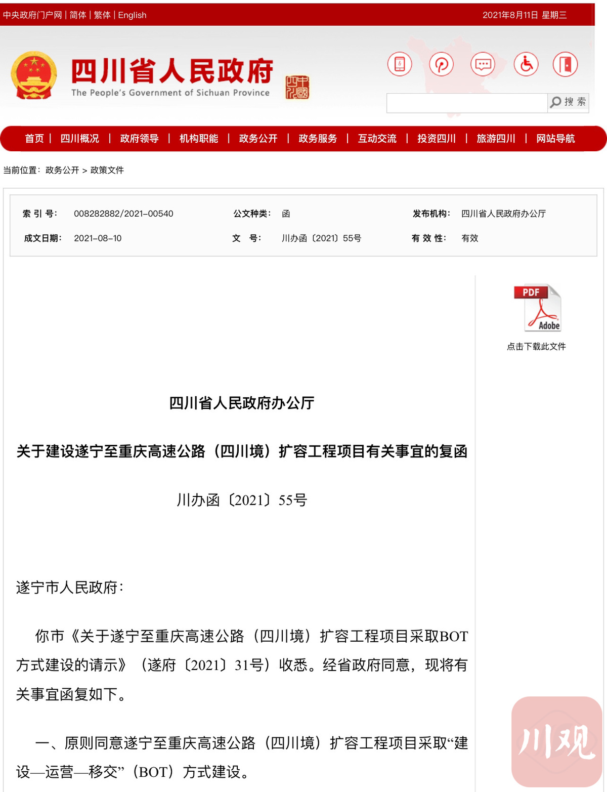备受关注的遂渝高速公路扩容改造项目有新进展。8月11日,川观新闻记者从省政府网站获悉,省政府批复了关于建设遂宁至重庆高速公路(四川境)扩容工程项目有关事宜的请示,原则同意该项目采取“建设—运营—移交”(BOT)方式建设。