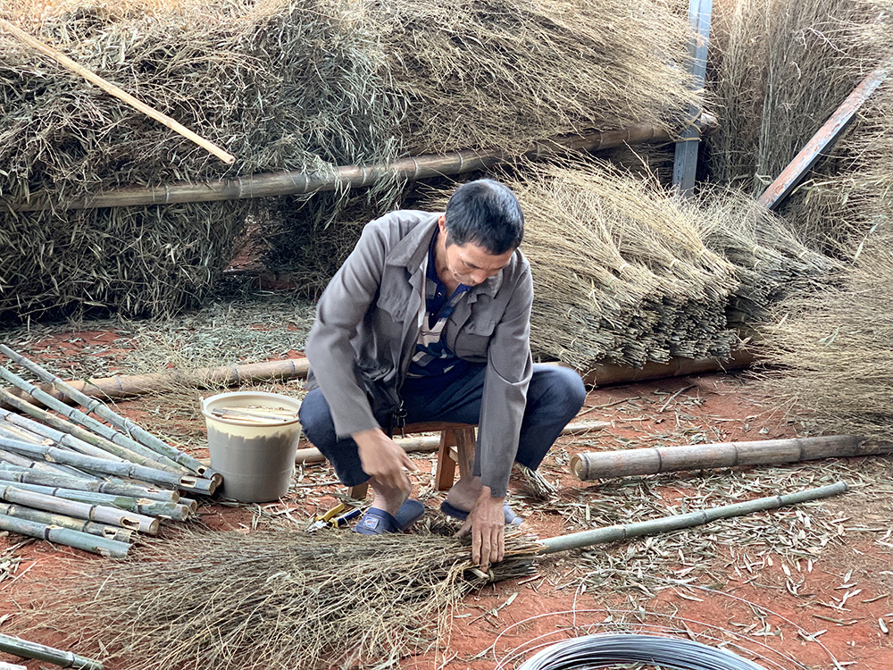 以前,石永成的工作就是帮竹子加工厂砍山上的楠竹,还要负责给厂里送去,村里路不方便,经济效益也很低。自从村里成立了专合社后,石永成就在专合社帮忙,在山上捡竹子的边角料背回专合社,再把边角料打理好,就开始制作扫把了。“一天可以制作60多把,每把扫帚能卖4元。隆昌、荣昌等地的环卫公司直接来购买,不愁销路,我只负责把扫把制作好。一个月能卖3000元左右。”石永成说。