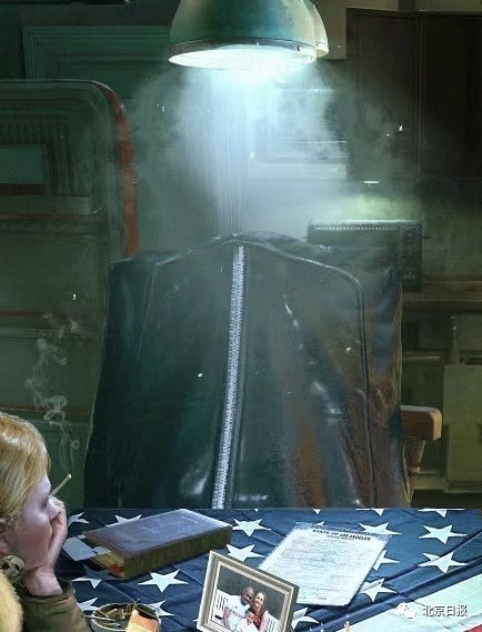 仔细一看,另一把椅子上放着一个黑色的裹尸袋, 桌上还有一份死亡证明和一本《圣经》。冷冷的灯光照在裹尸袋上,让人毛骨悚然。