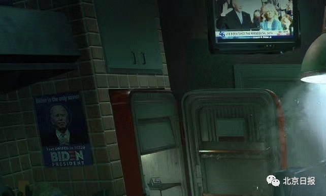 画作的正上方,电视里播出的画面正是拜登宣誓就职的场景。 左边墙上贴着拜登的宣传海报,主题是"Biden is the only savior"(拜登是唯一的救主)。