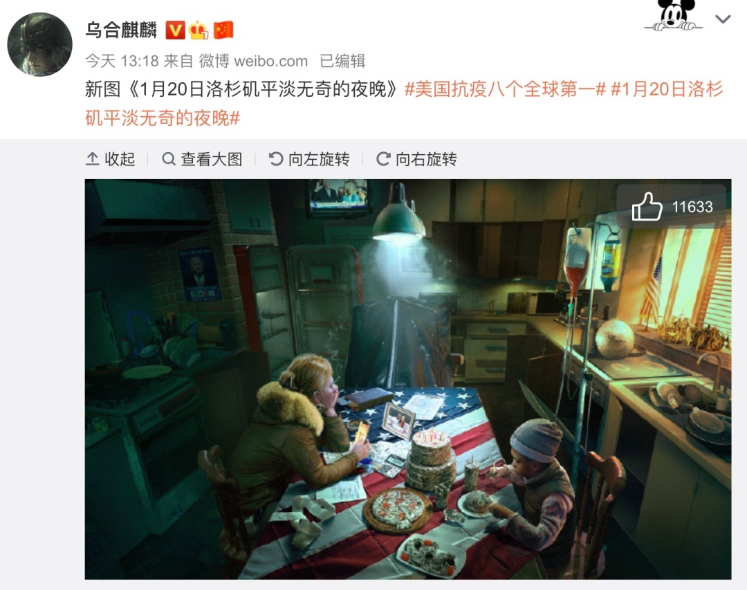 画家@乌合麒麟 发布新作《1月20日洛杉矶平淡无奇的夜晚》, 通过描绘洛杉矶一个家庭厨房的场景,揭露了彭博社这一言论的荒谬性。
