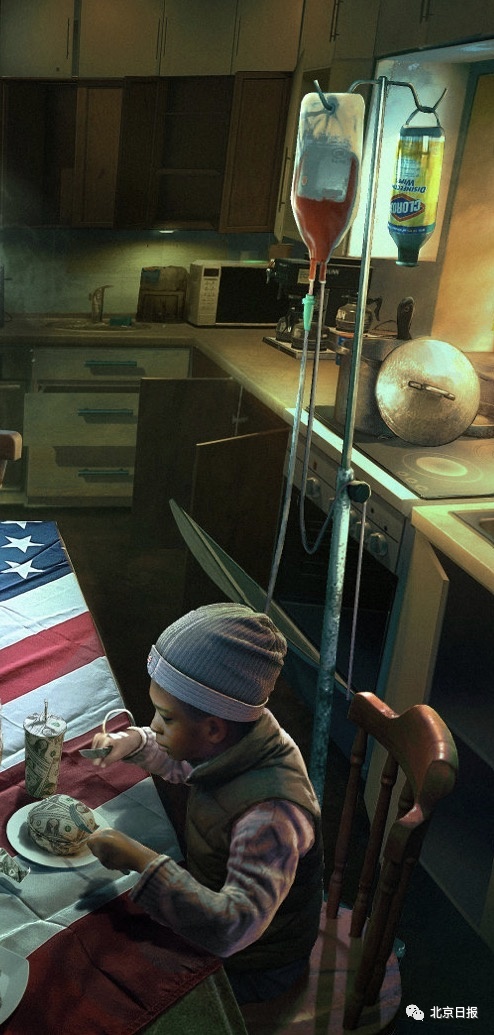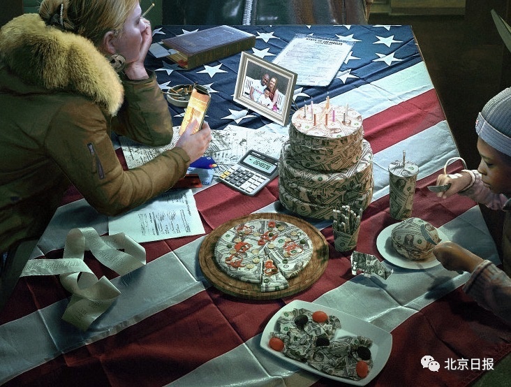 在@乌合麒麟 这幅画作的正中央,是一个以美国国旗为桌布的餐桌,上面摆着美元做的蛋糕、汉堡、薯条、沙拉、披萨、饮料,小男孩拿着刀叉,不知如何下口。