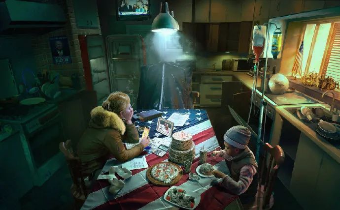 电视里,就职典礼庄严肃穆、演讲慷慨激昂,电视机外,很久未洗的餐具堆积如山,绿植早已枯萎,橱柜和冰箱里空空荡荡,一家人的出路不知在何方。