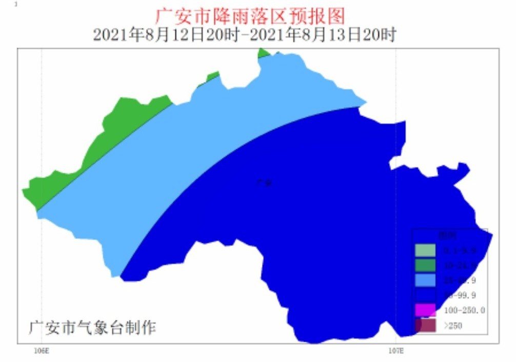 广安市气象台预计,12日20时到13日20时,广安区、邻水县、华蓥市、前锋区有一次暴雨天气过程。