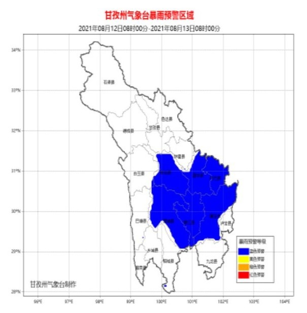 此外,甘孜州气象台凌晨发布的暴雨蓝色预警生效中,预计降雨将持续到13日8时,康定、丹巴、道孚、新龙、雅江、理塘境内有暴雨。
