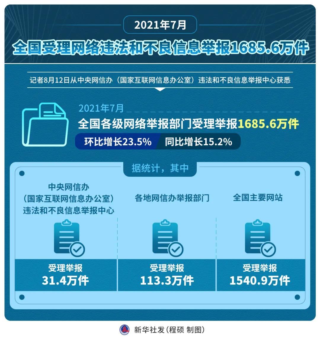 ●今年7月,全国受理网络违法和不良信息举报1685.6万件,环比增长23.5%、同比增长15.2%。