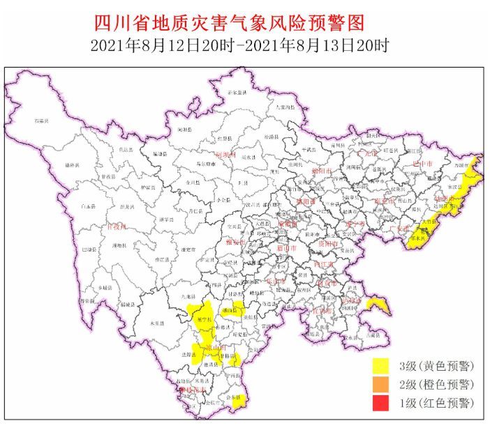 8月12日,四川省地质灾害指挥部办公室根据四川省地质环境条件,结合四川省气象台天气预报情况,发布地质灾害气象风险预警:8月12日20时至8月13日20时,共有5市(州)的21个县(市、区)进入黄色预警范围,较前一日有所扩大。