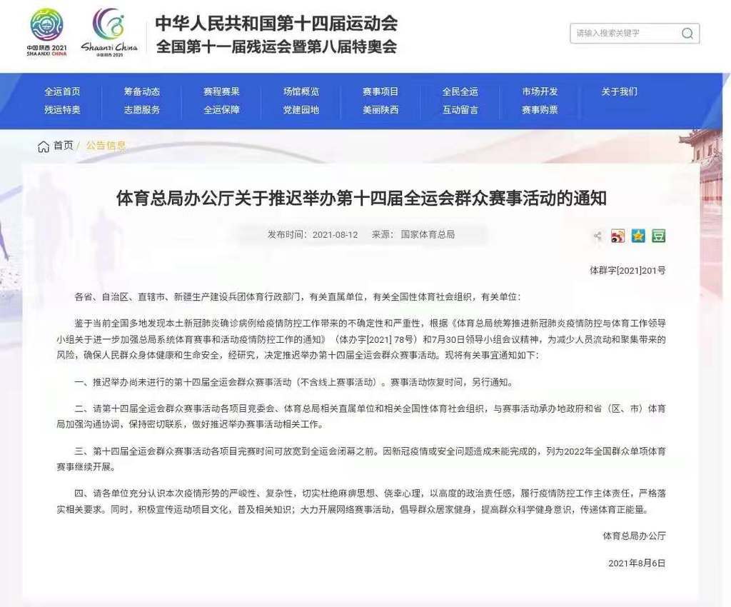 国家体育总局办公厅消息,决定推迟举办第十四届全运会群众赛事活动。赛事活动恢复时间,另行通知。