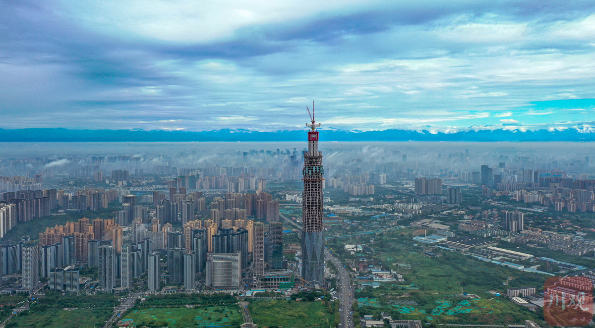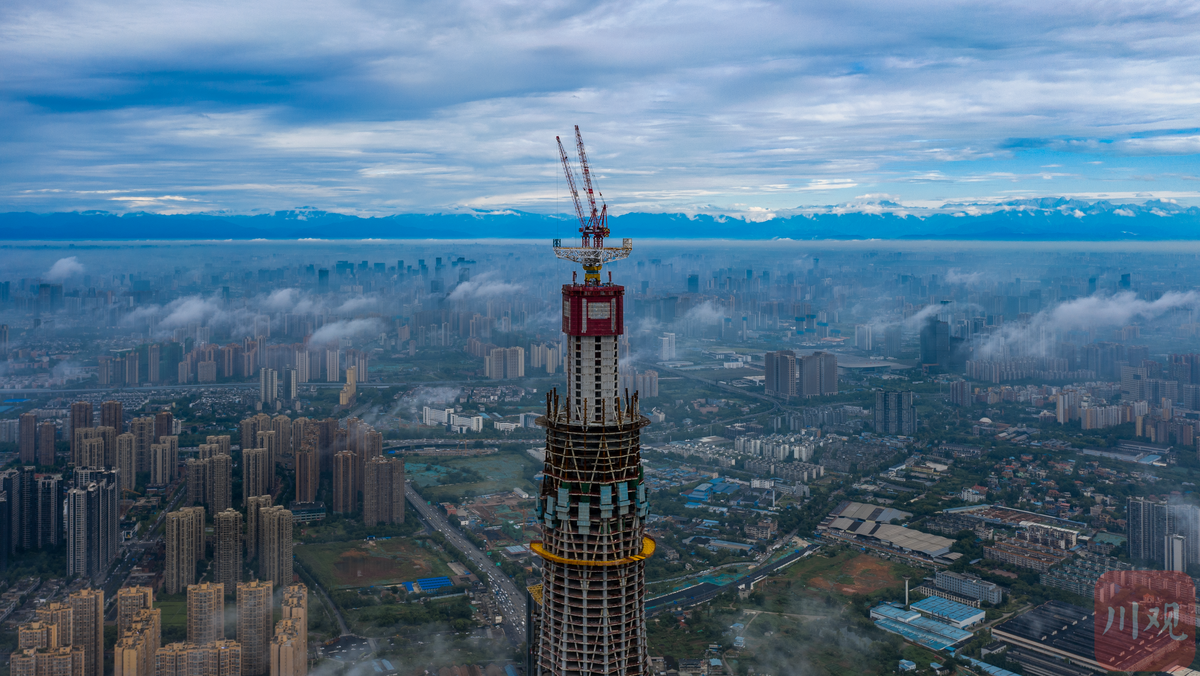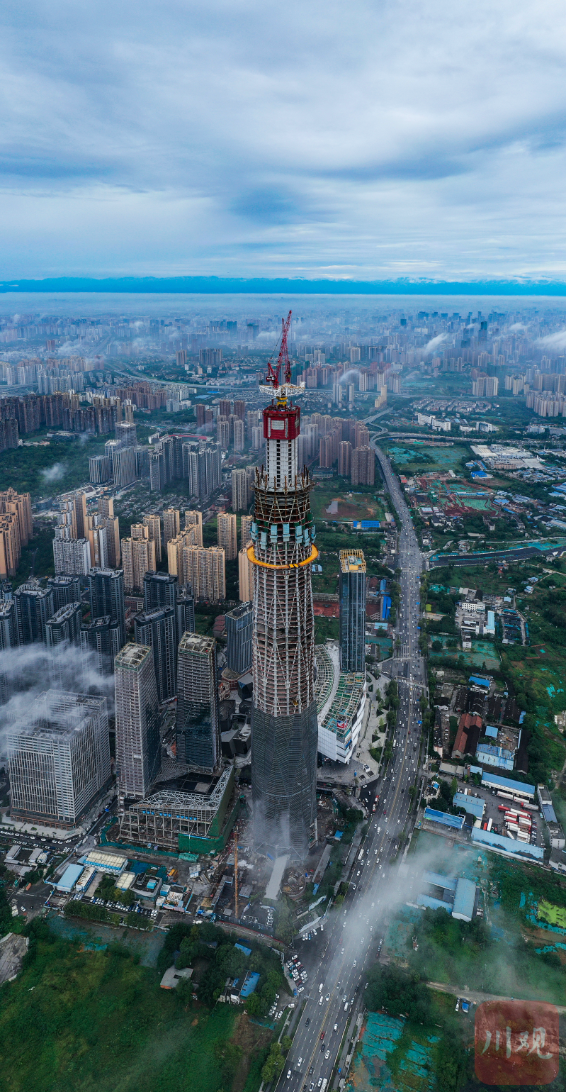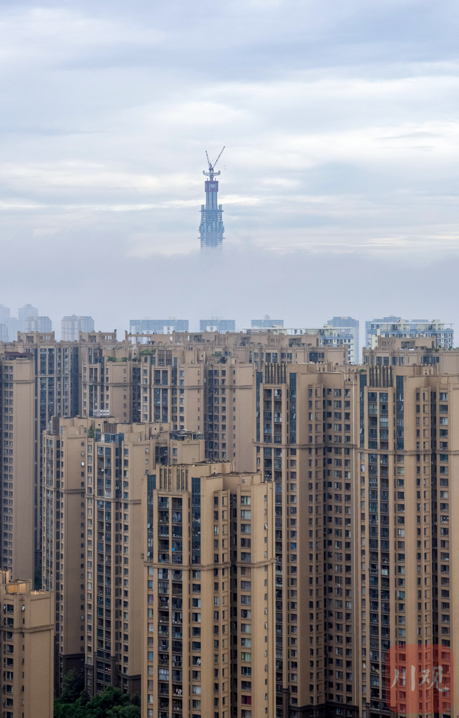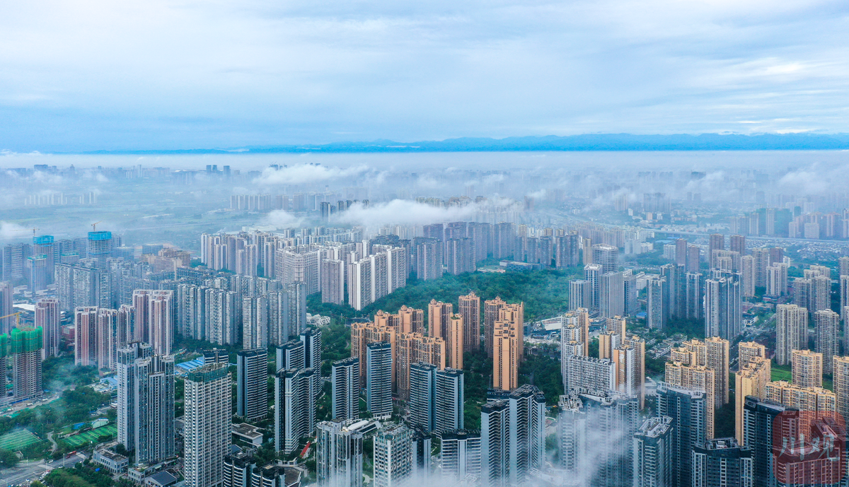 8月13日,雨后的成都市出现平流雾,从蜀峰468高楼往城市望去,薄雾将高楼笼罩起来,盆地北面的山峰格外清晰。