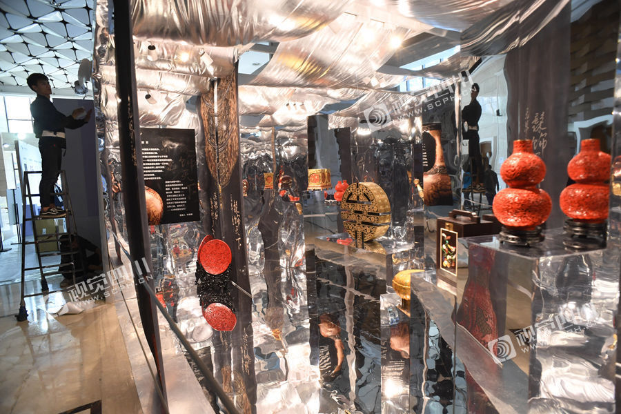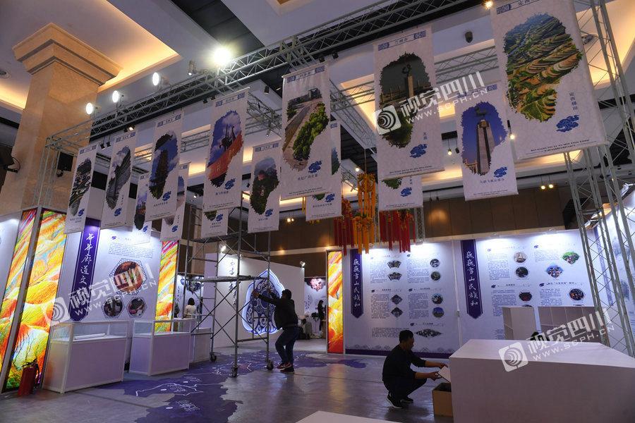 非遗传承助力脱贫攻坚和乡村振兴成果展区,工作人员加紧布置。