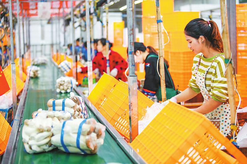 10月16日,遂宁市蓬溪县琪英菌业扶贫车间内,工人正忙着对杏鲍菇进行削菇、包装等工序。 刘昌松 摄(视觉四川)