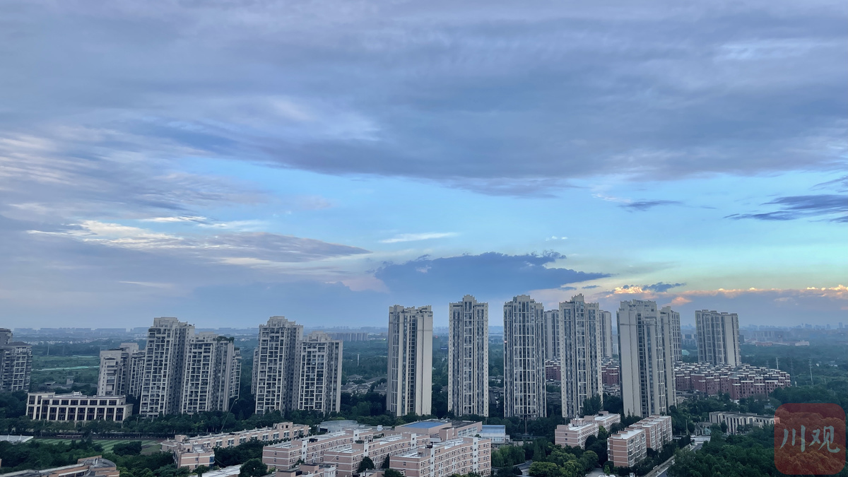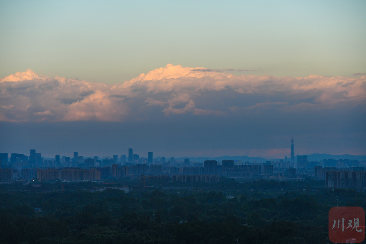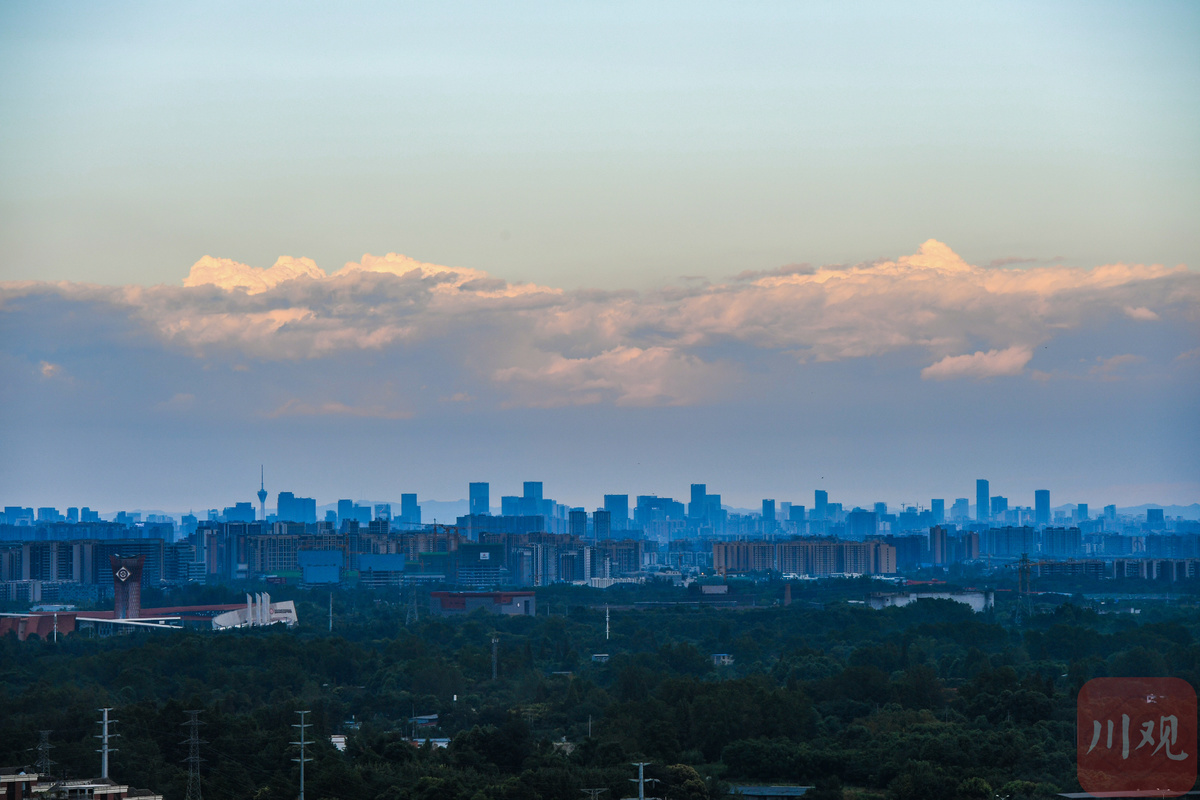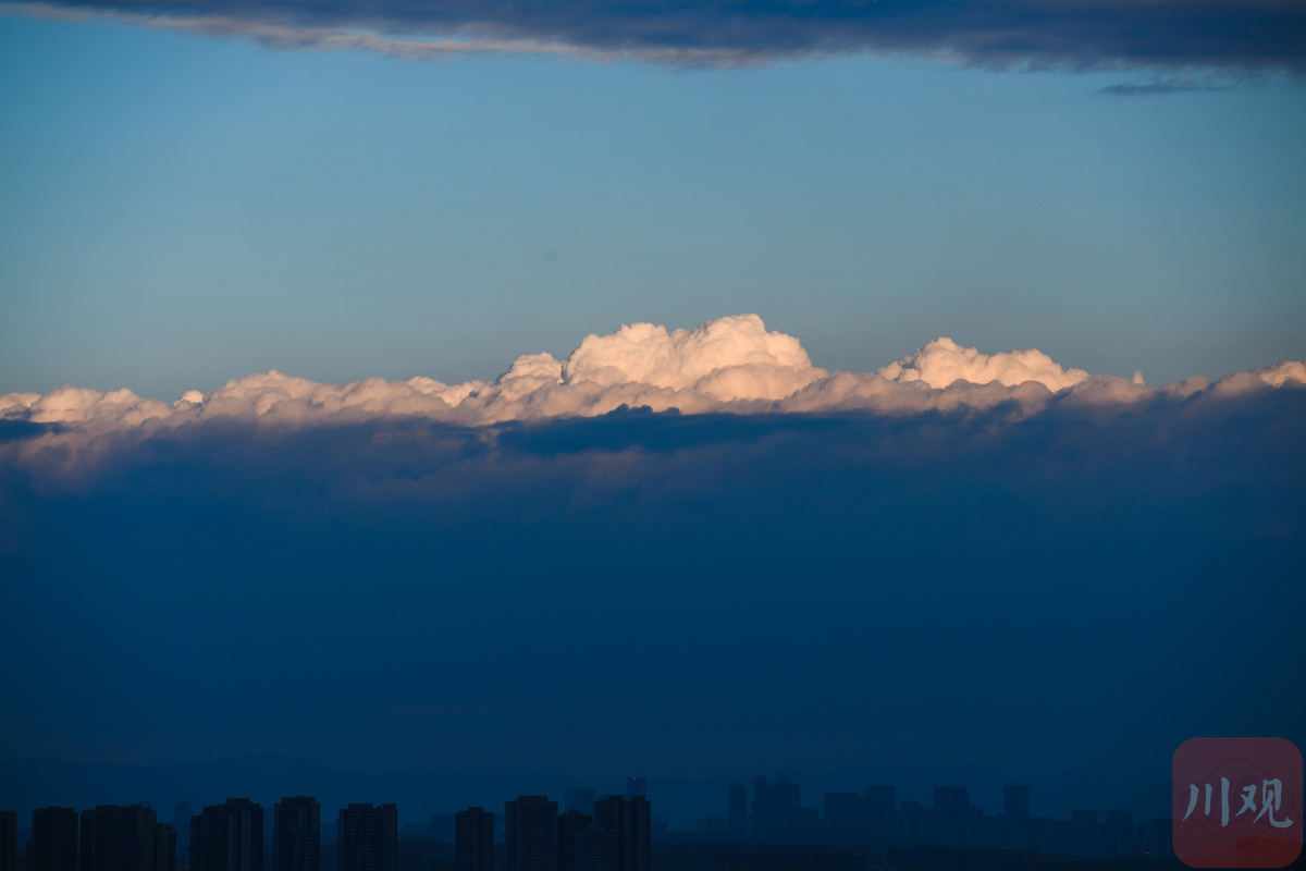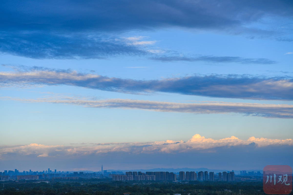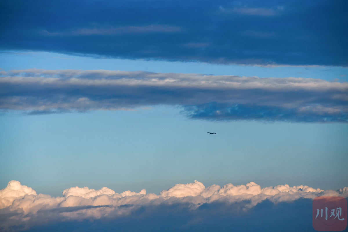 8月13日傍晚,成都东边云朵被夕阳余晖照亮,天空勾勒着一道道淡蓝的色彩,如同一幅漫画,一架架飞机在云朵中穿行。从西往东向成都城区望去,厚厚的云层被光亮分成渐变色,漂浮在空中,美得不真实。