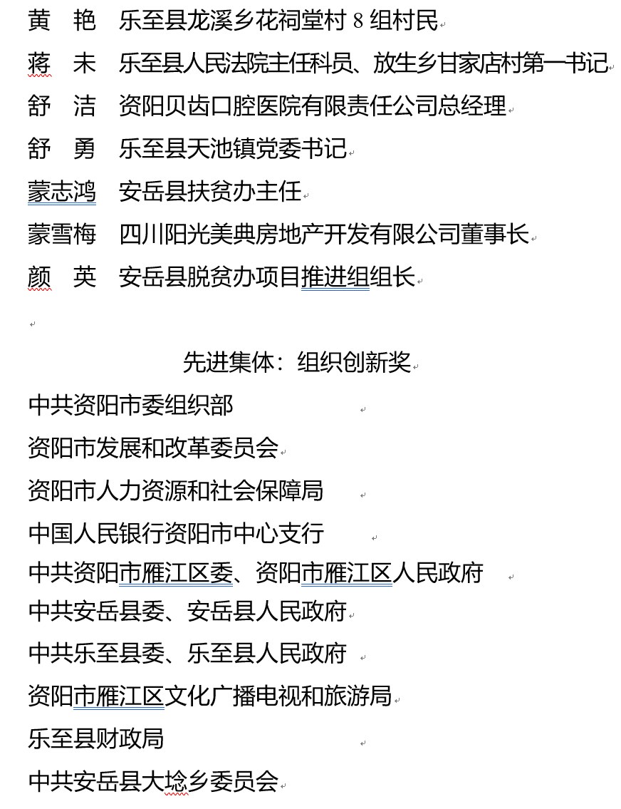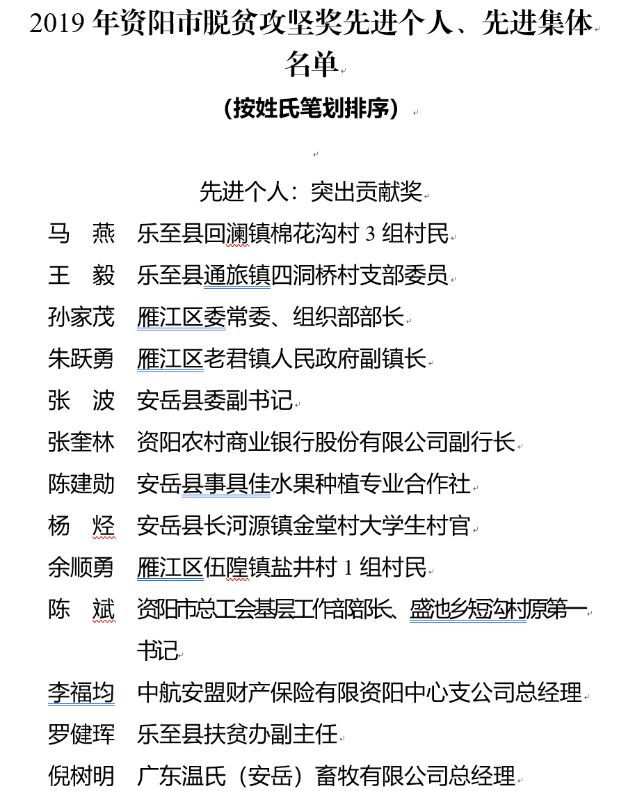 根据《中共中央国务院关于打赢脱贫攻坚战的决定》中“建立国家扶贫荣誉制度,表彰对扶贫开发作出杰出贡献的组织和个人”的要求,资阳市委、市政府决定,对马燕等20人“2019年资阳市脱贫攻坚奖先进个人”、中共资阳市委组织部等10个单位“2019年资阳市脱贫攻坚奖先进集体”予以通报表扬。