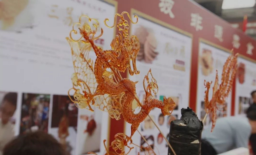 糖画是一种民间传统手工技艺,以糖为材料来进行绘画造型。所用工具仅一勺一铲,糖料一般是红、白糖加上少许饴糖在炉上用温火熬制,熬到可以牵丝时即可以用来浇铸造型。