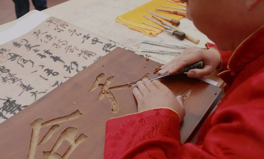 清光绪22年(1897年),原眉山城关下西街人刘天缘传承祖上木刻技艺,经多年积累和创新,形成了刘氏匾联木刻技艺,其技艺精湛,远近闻名,被称为“眉州刘一刀”。其主要技法及流程:精选书法、缩放清样、择木制匾、清样拓印、初刻成型、精刻显神、精心打磨、配色上漆、勾字贴金等。